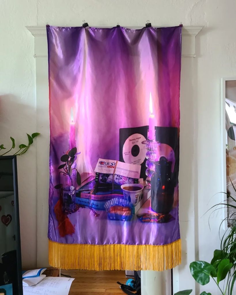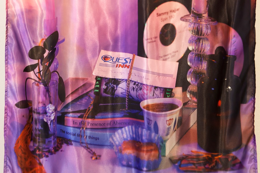 In the Presence of Absence, 2022. Inkjet printed satin with chainette fringe trim, 34×58″. Loose Ends group exhibition. Photos 1-5 by Karen Asher. Mentoring Artists for Women’s Art (MAWA), Treaty 1 Territory, Winnipeg, MB, June 3-24, 2022.